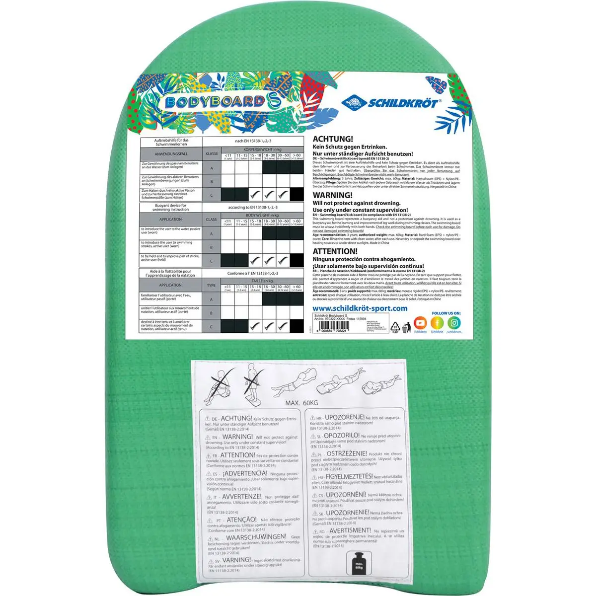 - ACHTUNG! Kein Schutz gegen Ertrinken. Nur unter ständiger Aufsicht benutzen! DE − Schwimmbrett/Kickboard (gemäß EN 13138-2). Das Produkt ist keine Schwimmhilfe